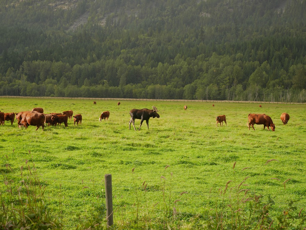 Almost at Bella Coola we stopped at a station that photographers got access to bears feeding, it was an electrified pen for the people! We missed the bears but this moose was stopping his own photo crew. He was romantically approaching the cattle and getting rebuffed each time!