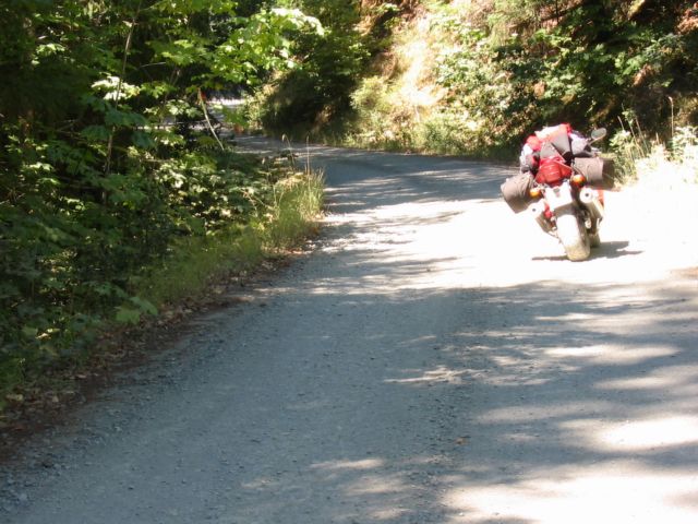 The road degenerates ... this could have been more fun on a V-Strom, I wouldn't have held back and practiced my flat track technique with the rear tire in a slide. I had my hands full with a 600lb bird and a bald tire.